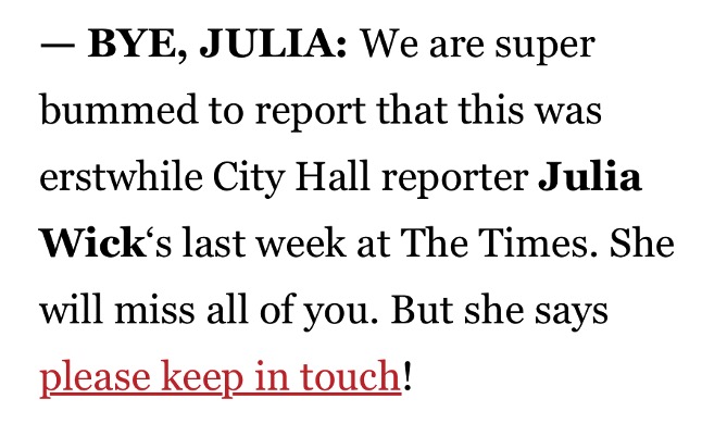 Awww, where is Julia Wick of the Times going?