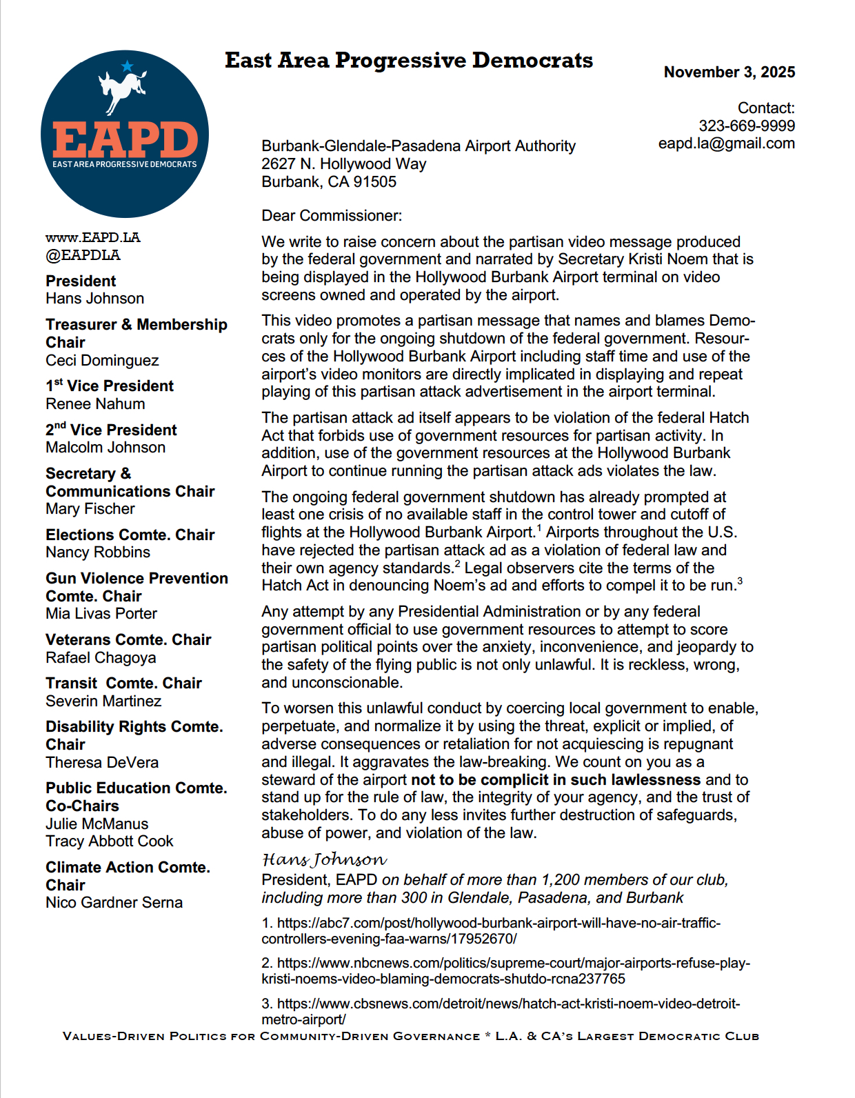 On Monday, November 3, EAPD wrote to members of the 9-member Airport Authority that oversees the Burbank airport, a government facility, and its operations to urge them to pull the plug on the Noem attack ad, which has been running on loop on dozens of video screens there for more than two weeks.