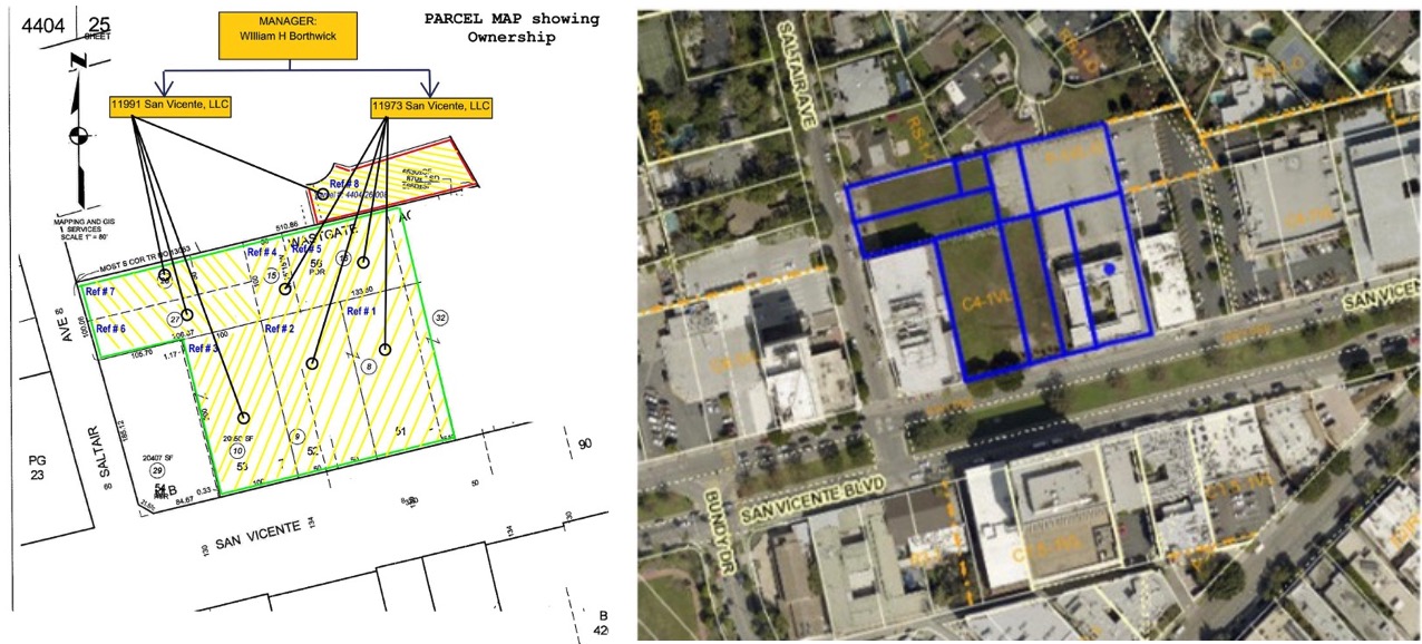 According to parcel maps, these properties—including the Barry Building site—are managed by two entities: 11991 San Vicente, LLC and 11973 San Vicente, LLC, both managed by one person, William H. Borthwick. By clearing everything except the Barry Building, the owners have created a manufactured blight, holding the neighborhood hostage until they can secure the demolition of the final piece.